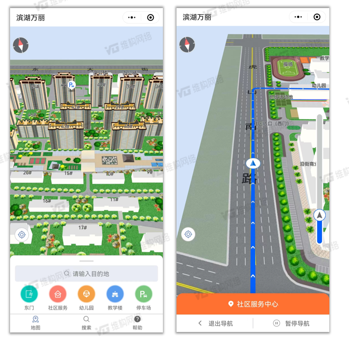 維小幫通過三維模型地圖、智能路線規劃、實時定位導航等技術,實現高精度人員導航,為新入住的業主和訪客快速了解社區及周邊,提供一站式數字化服務解決方案。助力濱湖萬麗小區打造信息化、新形態小區,為住戶提供安全、舒適、便利的現代化和智慧化的生活環境。