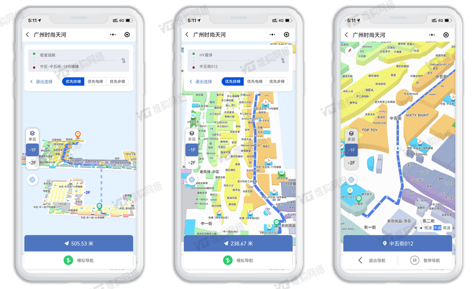 用戶自由選擇起點和終點,系統(tǒng)規(guī)劃最優(yōu)路徑指引,界面顯示路徑總距離,導(dǎo)航過程中支持語音播報,支持導(dǎo)航指引暫停、速度調(diào)整,可選擇樓梯優(yōu)先或電梯優(yōu)先的跨層方式。提供人性化導(dǎo)航服務(wù)。