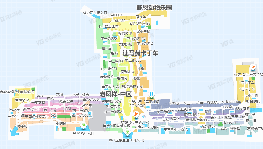 基于維小幫可視化地圖系統(tǒng)為支撐平臺,將大范圍線下場景快速形成高精度的室內(nèi)3D電子地圖,直觀展示商業(yè)綜合體內(nèi)店鋪分布,使空間中的店鋪、出入口、客服中心、衛(wèi)生間等全要素得以精準坐標映射。并支持放大、縮小、旋轉(zhuǎn),支持多層展示。