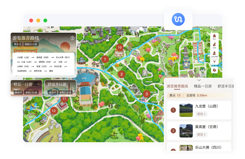 景區方根據運營需求和景區特色,設定推薦游玩路線;游客根據游玩需求,結合景點設定自由路線。