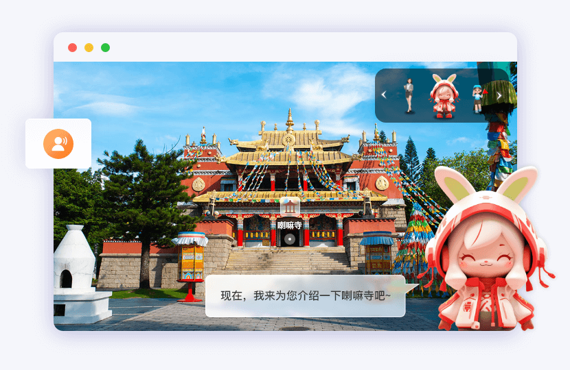 通過3D數字人形象為游客提供自動觸發、多語言、可互動的智能講解服務,讓景區導覽更生動有趣。支持數字人形象定制、卡通IP建模。