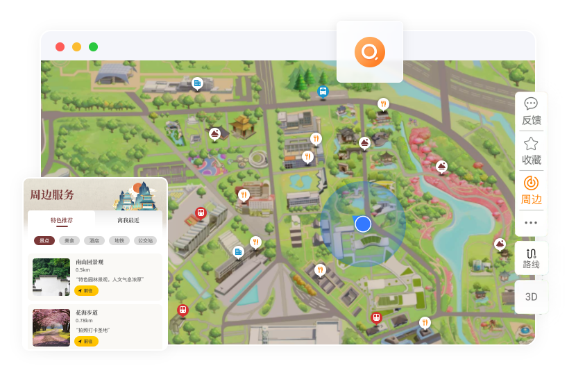 一鍵查詢周邊景點、酒店、公交地鐵等便民信息,并提供實時導航,優先推薦景區合作商戶,既方便游客又助力商業運營。